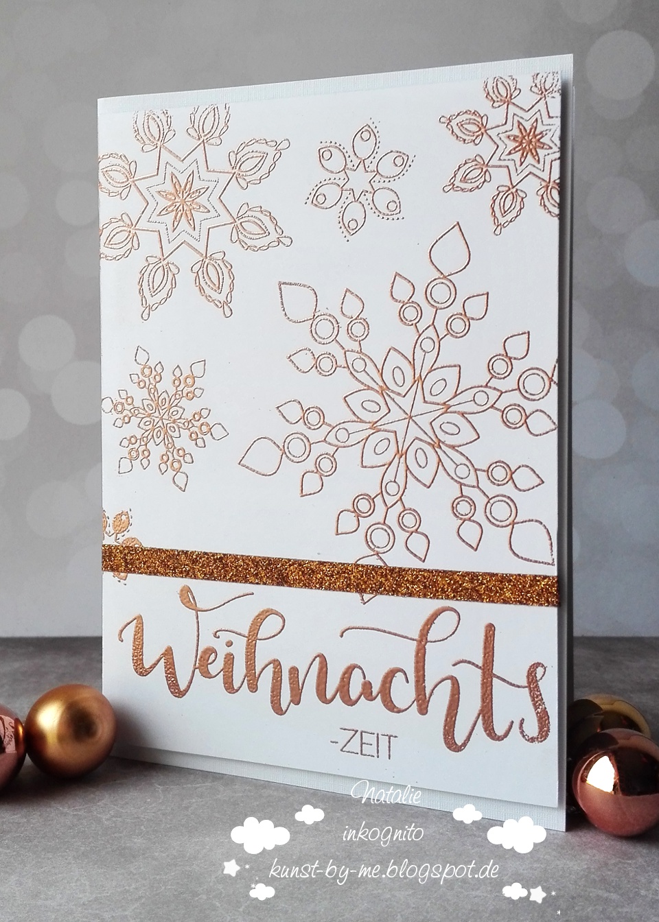 In the middle is an embossed christmas sentiment by Create a Smile. (They have a similar one in english too!) But next time I will first color and than emboss the sentiment. When making a background with Distress Inks, the color on top of the embossing is whiped off easily, but not with my water colors. They wanted to stay on the embossing.